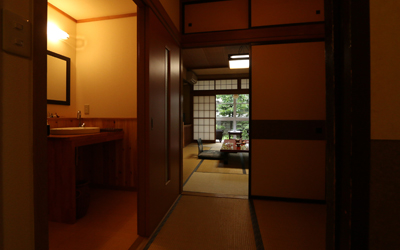 Once you enter the entranceway and proceed down the cobbled corridor where the hot spring curtain flutters, you will find this Japanese-style room overlooking the garden. This is a room with a bidet toilet.