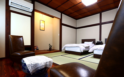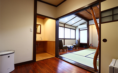 This is a ten tatami mat Japanese/Western-style room with one bed. We recommend this for families. This room comes with a basin and toilet, so you can bring small children here with peace of mind.