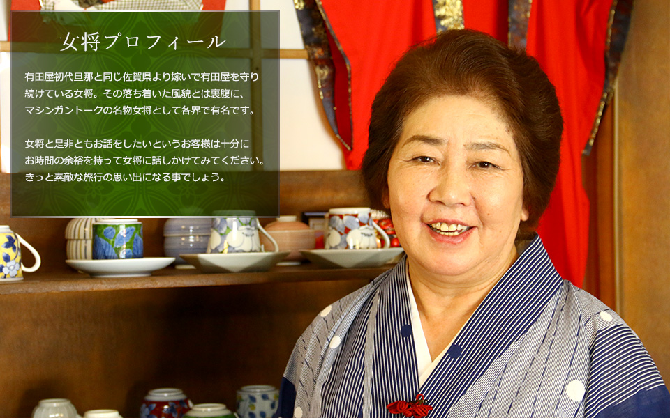 有田屋旅館は、明治時代中期に初代の旦那が佐賀県から有田焼きの卸と小売を行っている中で、大正4年に宿を創業したことに始まり、現在に至ります。